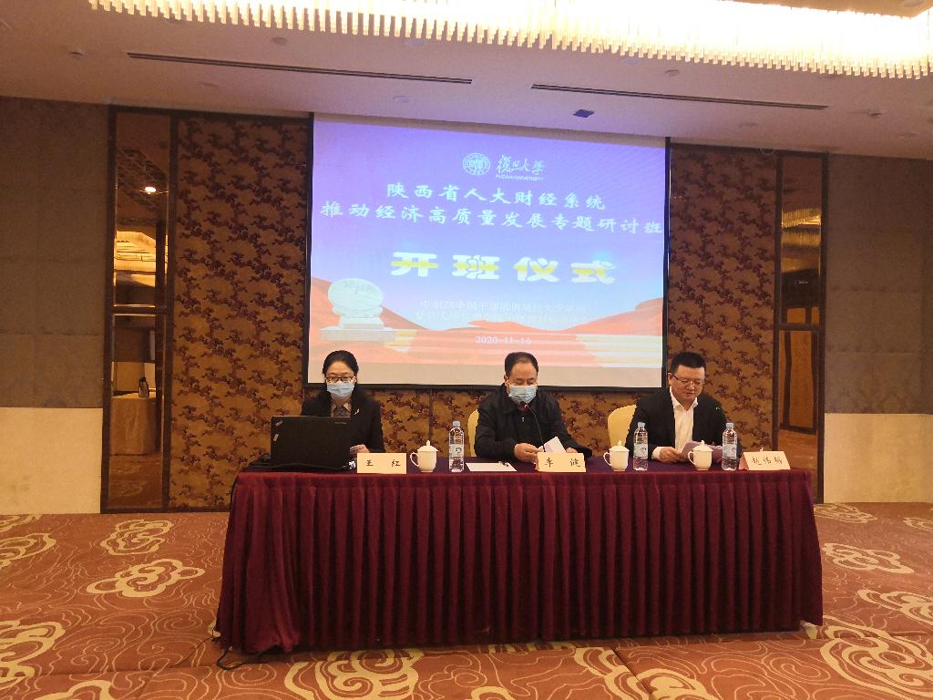 复旦大学管理学院党委副书记赵伟韬同志在开班仪式上致辞;陕西省人大财经委主任委员、常委会财经工委主任李健同志在开班仪式上讲话