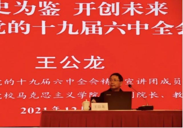 王公龙教授以《坚持和发展中国特色社会主义的政治宣言——深入学习贯彻党的十九届六中全会精神》为题,从“十九届六中全会召开的重大意义”、“全会精神的丰富内涵与核心要义”和“在深入学习贯彻全会精神上下功夫”三方面进行了展开。