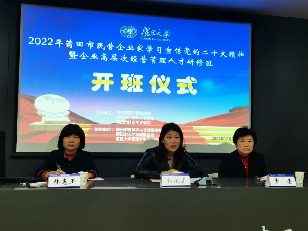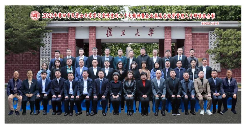 12月2日-12月5日,由市委统战部、市工商联(总商会)、市社会主义学院主办,市高层次人才交流协会、莆田市人才发展基金会承办的莆田市民营企业家学习宣传党的二十大精神暨企业家高层次经营管理人才研修班在复旦大学成功举办。市委常委、统战部部长郭宋玉全程参加并作开班动员讲话。市工商联(总商会)企业家副主席(副会长)、部分异地莆田商会会长和市人才基金会相关人员近50人参加培训。