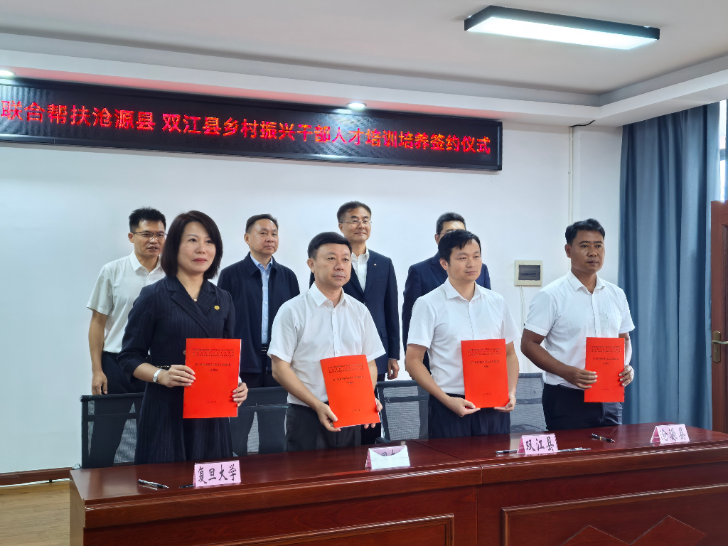 2025年7月9日上午,在临沧市沧源县班洪乡党校,四方共同签订《中国东方航空集团有限公司工会委员会、复旦大学联合帮扶沧源佤族自治县人民政府、双江拉祜族佤族布朗族傣族自治县人民政府新一轮乡村振兴干部人才培训培养三年协议》。