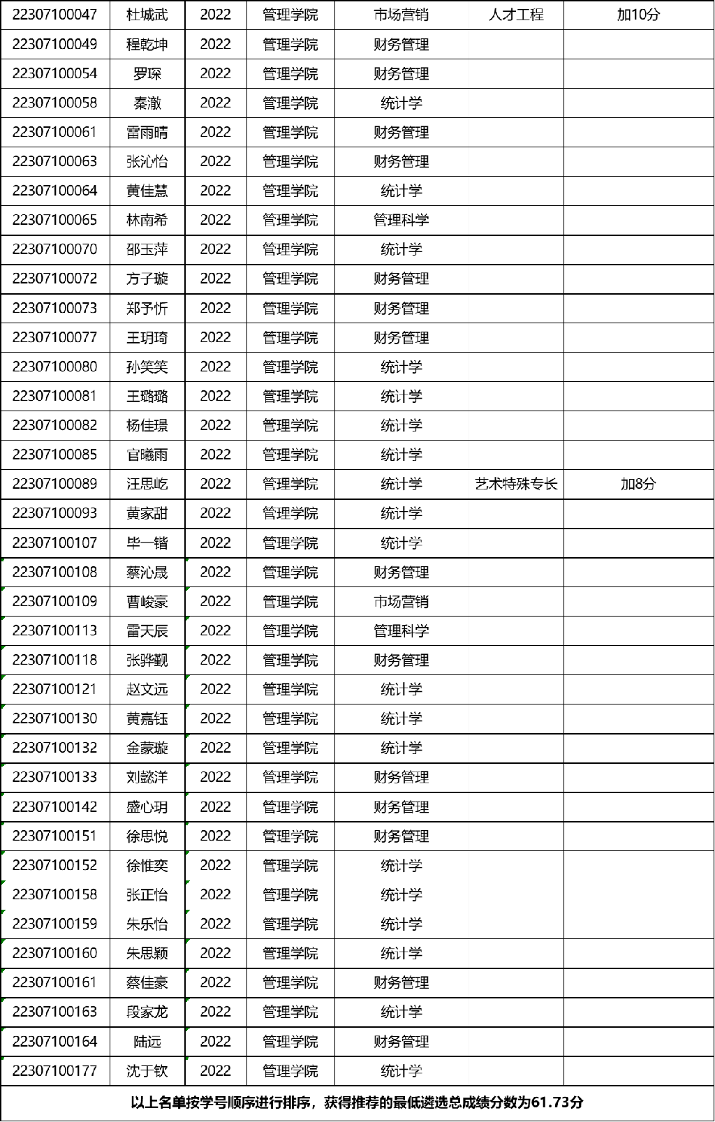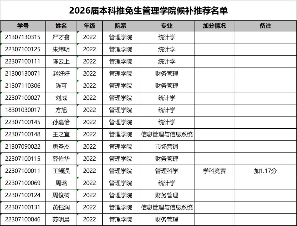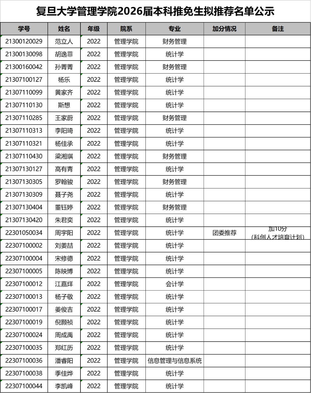 复旦大学管理学院2026届本科推免生拟推荐名单公示