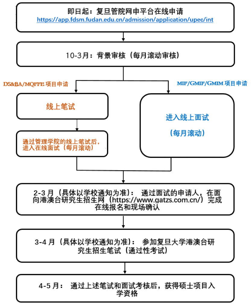 自2025年10月起,复旦管院将组织一系列线上与线下招生宣传活动,具体申请流程请参考下方图片。面试审核为每月滚动进行,面试轮次时间参考如下,根据往年招生情况,建议大家及早申请。